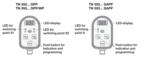 緊湊型號TN 552 GPP和TN 552/1 GPP有兩個獨(dú)立的可調(diào)節(jié)開關(guān)點(diǎn)。緊湊型號TN 552 GAPP和TN 552/1 GAPP具有一個獨(dú)立的可調(diào)節(jié)開關(guān)點(diǎn)和一個可擴(kuò)展的4 ... 20 mA模擬輸出。