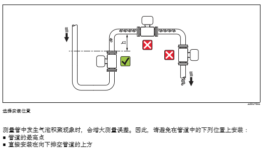 測(cè)量管中發(fā)生氣泡積聚現(xiàn)象時(shí),會(huì)增大測(cè)量誤差。因此,請(qǐng)避免在管道中的下列位置上安裝: • 管道的高點(diǎn) • 直接安裝在向下排空管道的上方 在豎直向下管道中安裝 在豎直向下管道(h ³ 5 m (16.4 ft))中安裝時(shí),需要在傳感器下游處安裝虹吸管或泄放閥,避免抽壓 時(shí)損壞測(cè)量管內(nèi)襯。此外,還可以防止液體短暫停滯在測(cè)量管中,產(chǎn)生氣障。