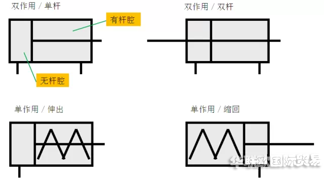 當(dāng)有桿腔進(jìn)氣,無桿腔排氣時(shí),使活塞桿縮回。若有桿腔和無桿腔交替進(jìn)氣和排氣,活塞實(shí)現(xiàn)往復(fù)直線運(yùn)動(dòng)。