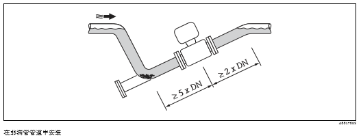 測(cè)量管中發(fā)生氣泡積聚現(xiàn)象時(shí),會(huì)增大測(cè)量誤差。因此,請(qǐng)避免在管道中的下列位置上安裝: • 管道的高點(diǎn) • 直接安裝在向下排空管道的上方 在豎直向下管道中安裝 在豎直向下管道(h ³ 5 m (16.4 ft))中安裝時(shí),需要在傳感器下游處安裝虹吸管或泄放閥,避免抽壓 時(shí)損壞測(cè)量管內(nèi)襯。此外,還可以防止液體短暫停滯在測(cè)量管中,產(chǎn)生氣障。